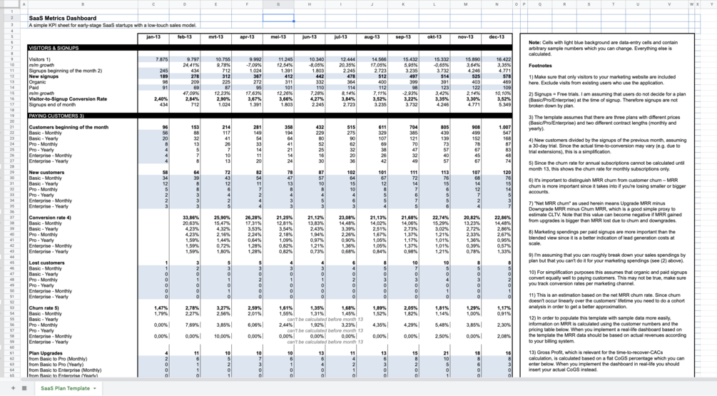 A simple KPI sheet for early-stage SaaS startups with a low-touch sales model.